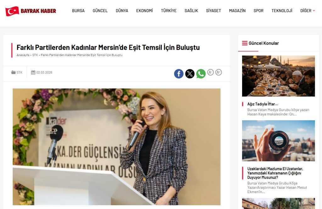 KA.DER Genel Başkanı Yeşim Akpolat: “Eşit temsil demokrasi meselesidir” Kadın Adayları Destekleme Derneği (KA.DER) tarafından düzenlenen “KA.DER Kürsü – Mersin Buluşması”, farklı siyasi partilerden kadın siyasetçileri, kadın muhtarları, belediye meclis üyelerini ve belediye başkan yardımcılarını bir araya getirdi. Toplantıda yerel siyasette kadınların karar alma mekanizmalarındaki temsili, yapısal engeller ve çözüm önerileri ele alındı. 31 Mart […]