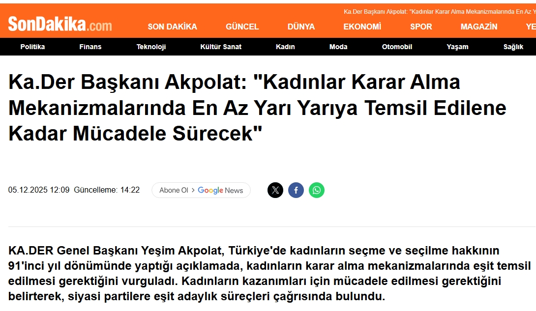 Basında Biz SonDakika | Ka.Der Başkanı Akpolat: “Kadınlar Karar Alma Mekanizmalarında En Az Yarı Yarıya Temsil Edilene Kadar Mücadele Sürecek” 5 Aralık 2025