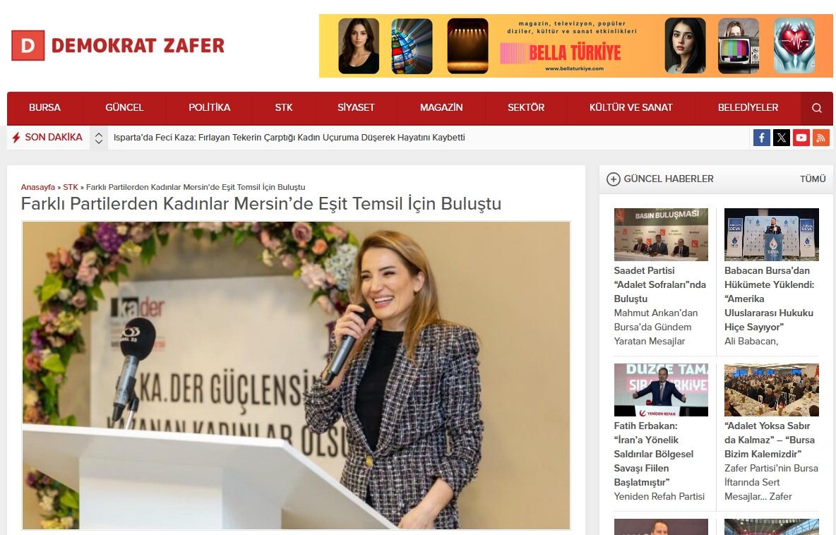 Kadın Adayları Destekleme Derneği (KA.DER) tarafından düzenlenen “KA.DER Kürsü – Mersin Buluşması”, farklı siyasi partilerden kadın siyasetçileri, kadın muhtarları, belediye meclis üyelerini ve belediye başkan yardımcılarını bir araya getirdi. Toplantıda yerel siyasette kadınların karar alma mekanizmalarındaki temsili, yapısal engeller ve çözüm önerileri ele alındı.