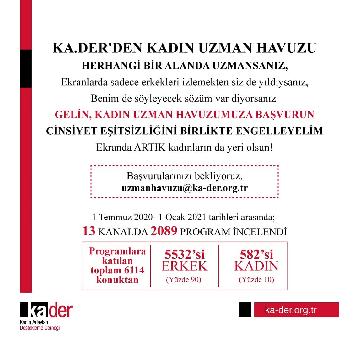 Medyada Toplumsal Cinsiyet Eşitliği Araştırmamızın yansımaları sürerken; KA.DER olarak yeni bir adım atarak ‘uzman havuzu’ çağrımızı yaptık. KA.DER Uzman Havuzu’nda alınında uzman, yetkin isimler birikmeye başladı. Cinsiyet eşitsizliğini birlikte engellemek için; uzman havuzu’muza sizlerin de desteğini bekliyoruz.