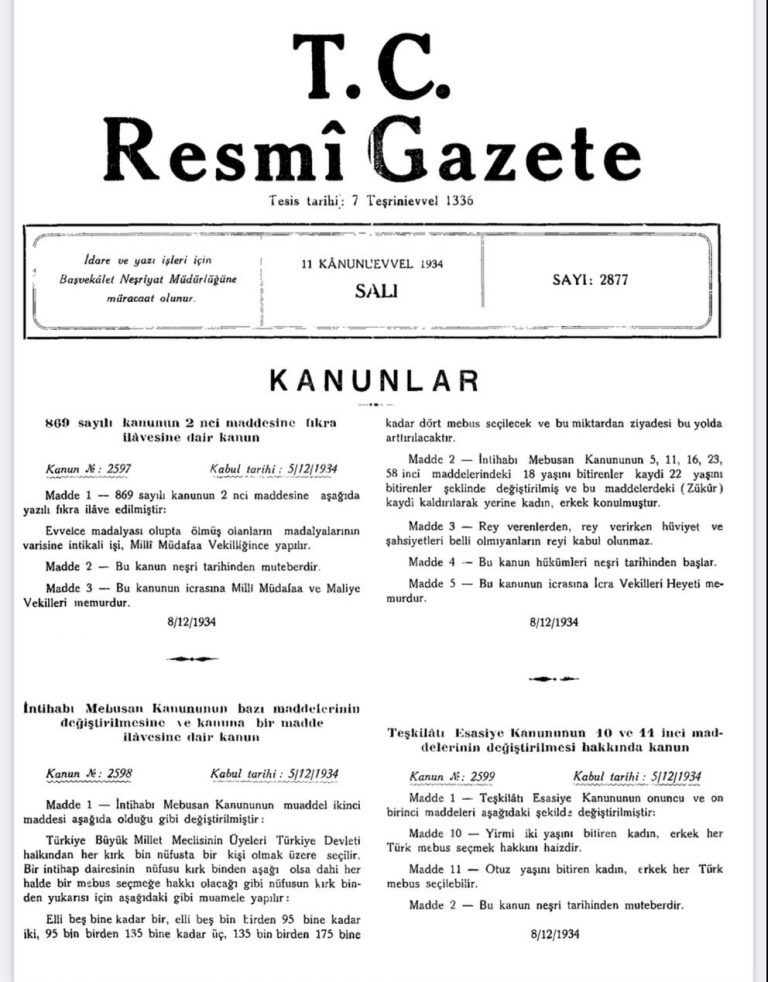 Kadınların, milletvekili seçme seçilme hakkını kullanmaları, Atatürk devrimlerinin yaşama geçirilmekteki kararlılığı ile mümkün olmuştur. Türkiye’de kadın haklarının 2000’li yıllarda tanındığını ileri sürmeye kalkışanlara verilecek en anlamlı cevap, 11 Aralık 1934 tarihli Resmi Gazetedir. Hem Anayasa değişikliği yapılarak kadınlara milletvekili seçme seçilme hakkı tanındı. Hem de Anayasal eşit hakkın kullanılabilmesi için aynı gün Milletvekili Seçim Kanunu’nda (İntihab-ı Mebusan Kanunu’nda) da değişiklik yapıldı ve 11 Aralık’ta aynı Resmi Gazetede her ikisi birlikte yayınlandı.