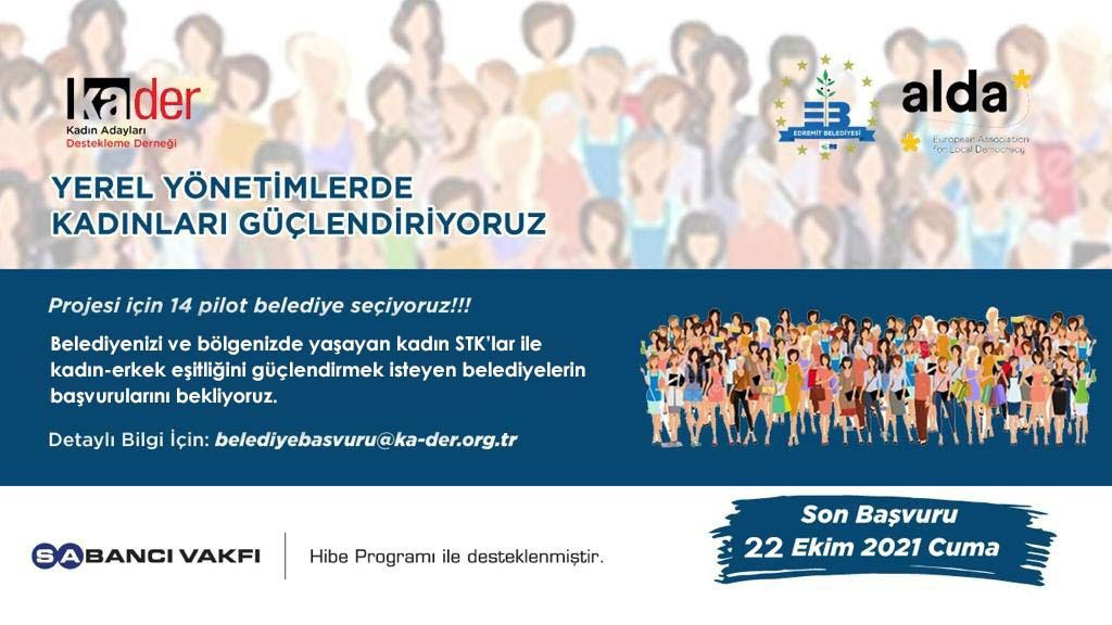 Sabancı Vakfı Hibe Programı kapsamında desteklenen Kadın Adayları Destekleme Derneği, Edremit Belediyesi ve Avrupa Yerel Demokrasi Ajansı (ALDA)’nın ortağı olduğu “Yerel Yönetimlerde Kadınları Güçlendiriyoruz” isimli projemiz için ülkemizin 7 bölgesinden 14 pilot il veya ilçe belediyesinde CEMR’in “Avrupa Yerel Yaşamda Eşitlik Şartı” rehberliğinde 12 aylık proje süresinde çalışmayı ve söz konusu belediyelerin toplumsal cinsiyet eşitliği konusunda hem personellerini hem de vatandaşlarını güçlendirmeyi hedeflemekteyiz.